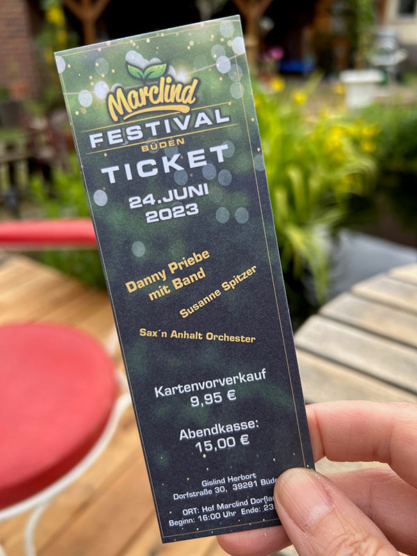 Dann schauen wir auf die Flyer und die Eintrittskarten. Die Bewerbung ist bereits in Gange - auch der Kartenverkauf. Die Gäste können sich ab 16 Uhr auf das Sax`n Anhalt Orchester freuen. Anschließend wird Susanne Spitzer singen und als Highlight dann Danny Priebe mit Band. Für das leibliche Wohl sorgen Herborts selber. Es wird sowohl für Kinder und Erwachsene ein Angebot vorgehalten. Lassen Sie sich überraschen. Gegen 23 Uhr ist das Ende der Veranstaltung avisiert. Marco Herbort ergänzt:" Wir sind wirklich froh, dass der Ortschaftsrat hinter uns steht und das unterstützt. Es haben sich schon einige Nachbarn angekündigt."