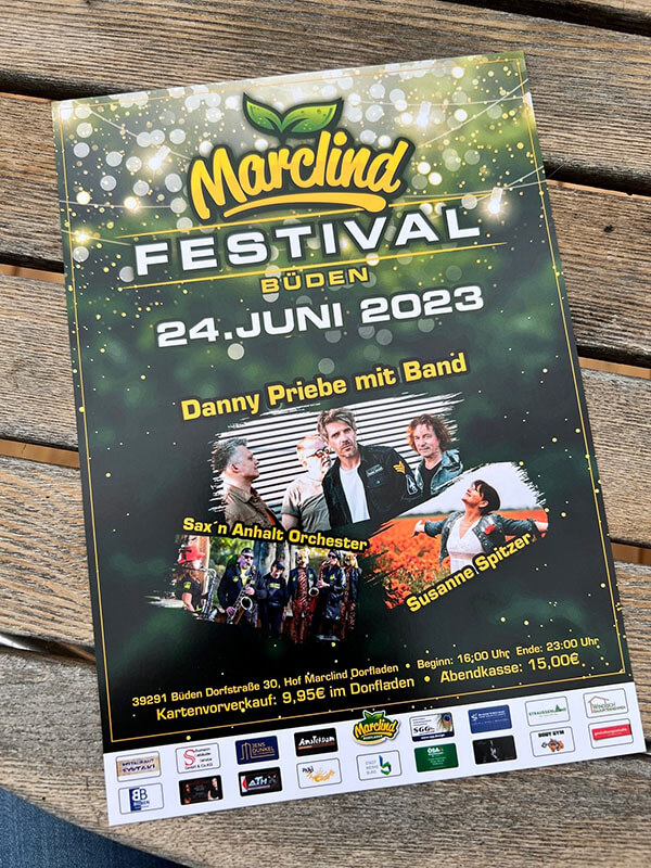 Marco Herbort: "Das hat sich tatsächlich Ende letzten Jahres - im Dezember - während eines Gesprächs mit einem Freund ergeben. Eigentlich hat er uns auf die Idee gebracht, weil wir ja hier viel Platz haben und bereits das ein oder andere Event (z.B. Halloween oder Adventszauber) erfolgreich über die Bühne gebracht haben. Der Gedanke ließ uns nicht mehr los und wir haben hier im Dorf eine Unterstützung und Hilfsbereitschaft erfahren, die uns optimistisch auf den Termin blicken lässt. Unser Büden hat gerade mal ca. 250 Einwohner*innen - darunter jedoch viele Unternehmer und handwerklich versierte Nachbarn und Dorfbewohner. So konnten wir vor kurzem unsere kleine "Seebühne" einweihen." Die Bühne für den Hauptact am 24. Juni - Danny Priebe mit Band - ist eine mobile Bühne und kommt für den Nachmittag/ Abend aus Magdeburg. Auf die Frage an Herborts, mit wie vielen Gästen sie rechnen, kam spontan: "mit ca. 400!"